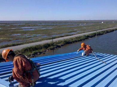 5、檢查彩鋼瓦整個屋頂?shù)奈⑿】p隙,然后用彩鋼專用的聚酯塑料防水材料涂刷并封堵。